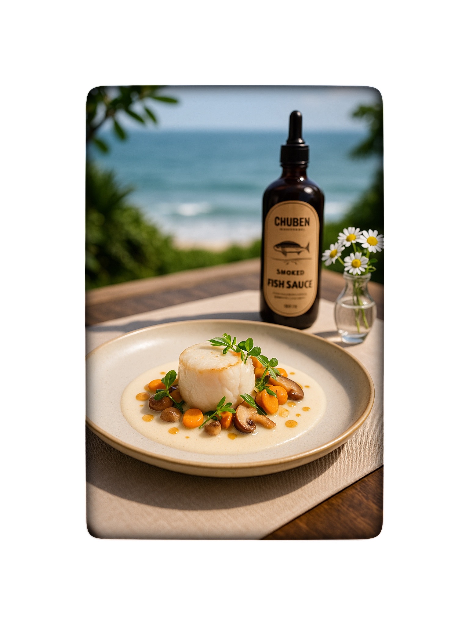 - Add the white wine and let it reduce completely. Add the Chuben smoked fish sauce, coconut milk, chili pepper and reserved ingredients. Heat gently for 10 minutes then add the lemon juice and sprinkle with chopped herbs. Serve hot.